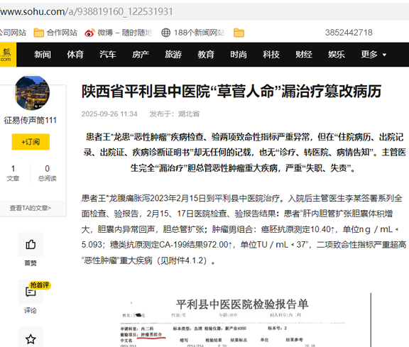 陕西省平利县中医院“草菅人命”漏治疗篡改病历