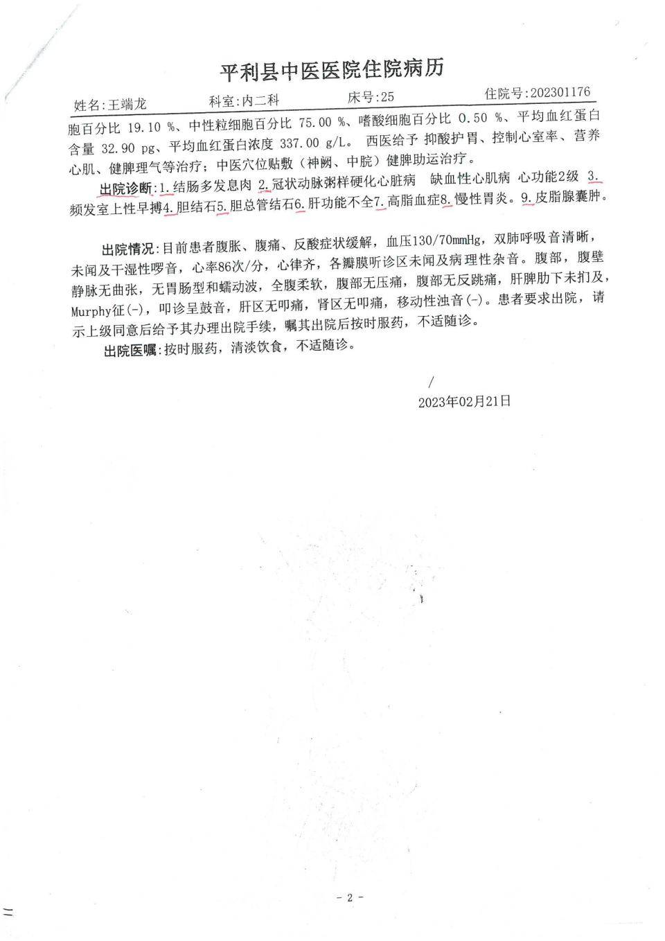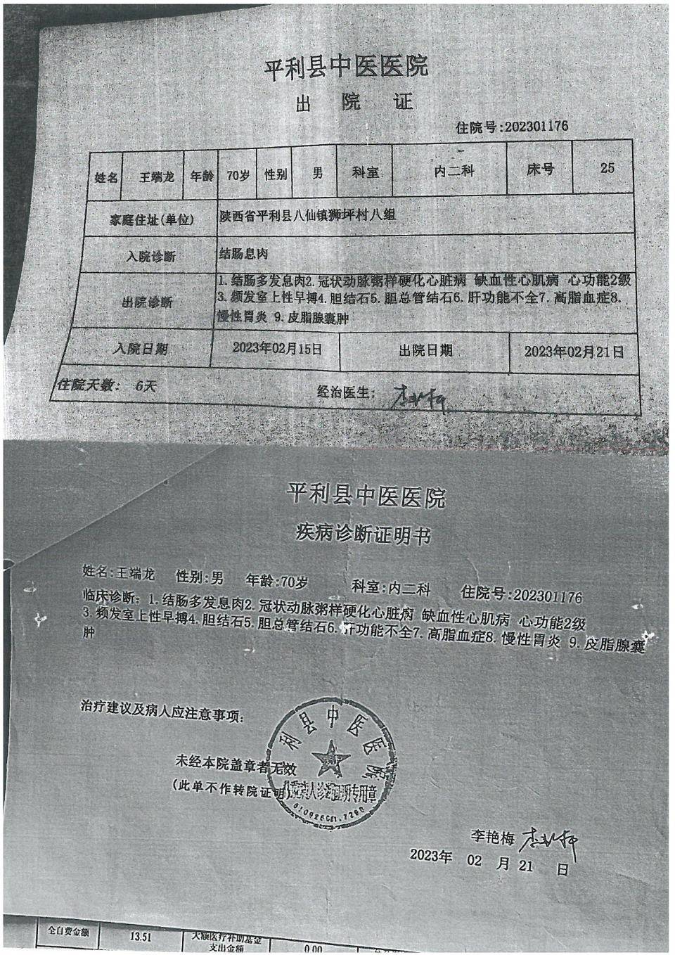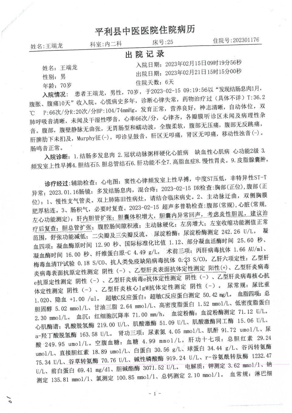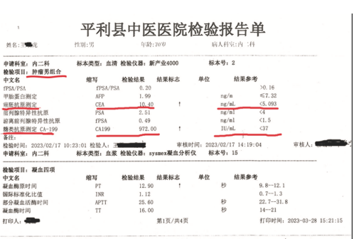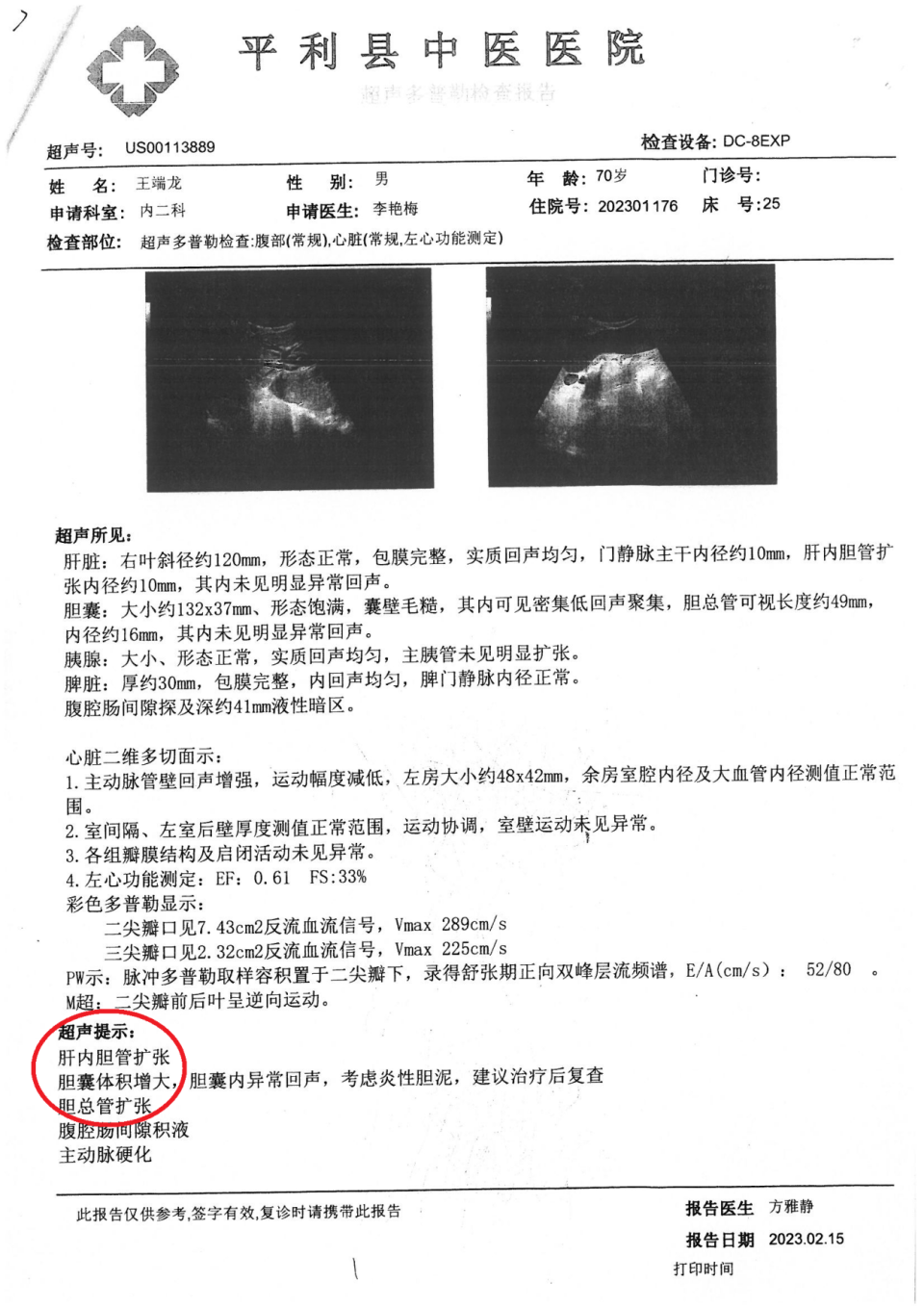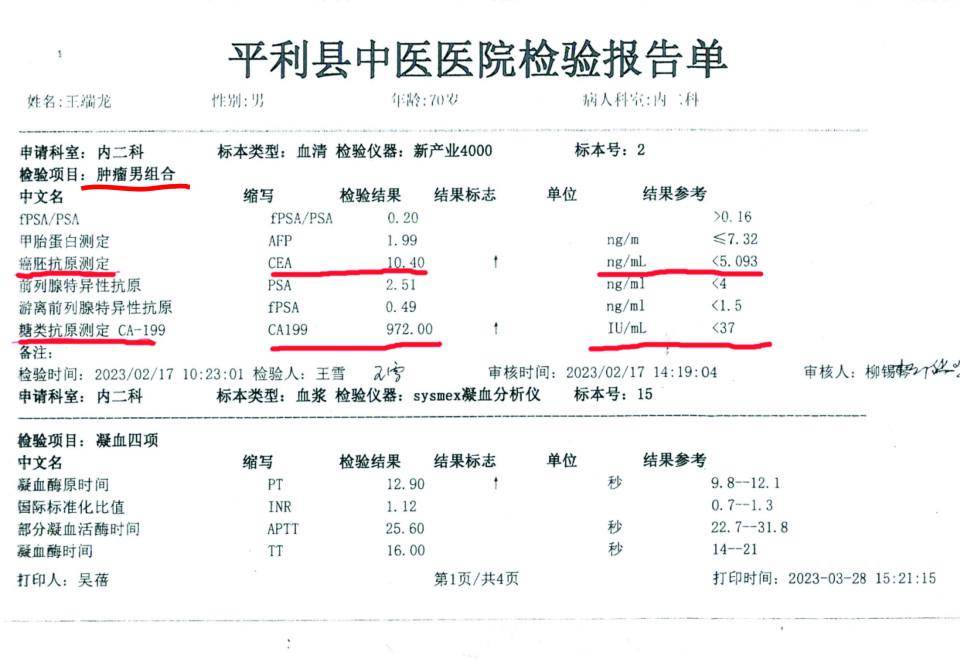 患者王*龙腹痛胀泻2023年2月15日到平利县中医院治疗。入院后主管医生李某签署系列全面检查、验报告,2月15、17日医院检查、验报告结果患者“肝内胆管扩张胆囊体积增大,胆囊内异常回声,胆总管扩张肿瘤男组合:癌胚抗原测定10.40↑,单位ng/mL﹤5.093;糖类抗原测定CA-199结果972.00↑,单位TU/mL﹤37”,二项致命性指标严重超高“恶性肿瘤”重大疾病(见附件4.1.2)。