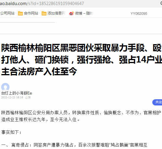 陕西榆林榆阳区公安分局办案人员,转换案件性质、偷换概念、不作为、官黑相护造成业主维权长达九年,至今无法入住。
